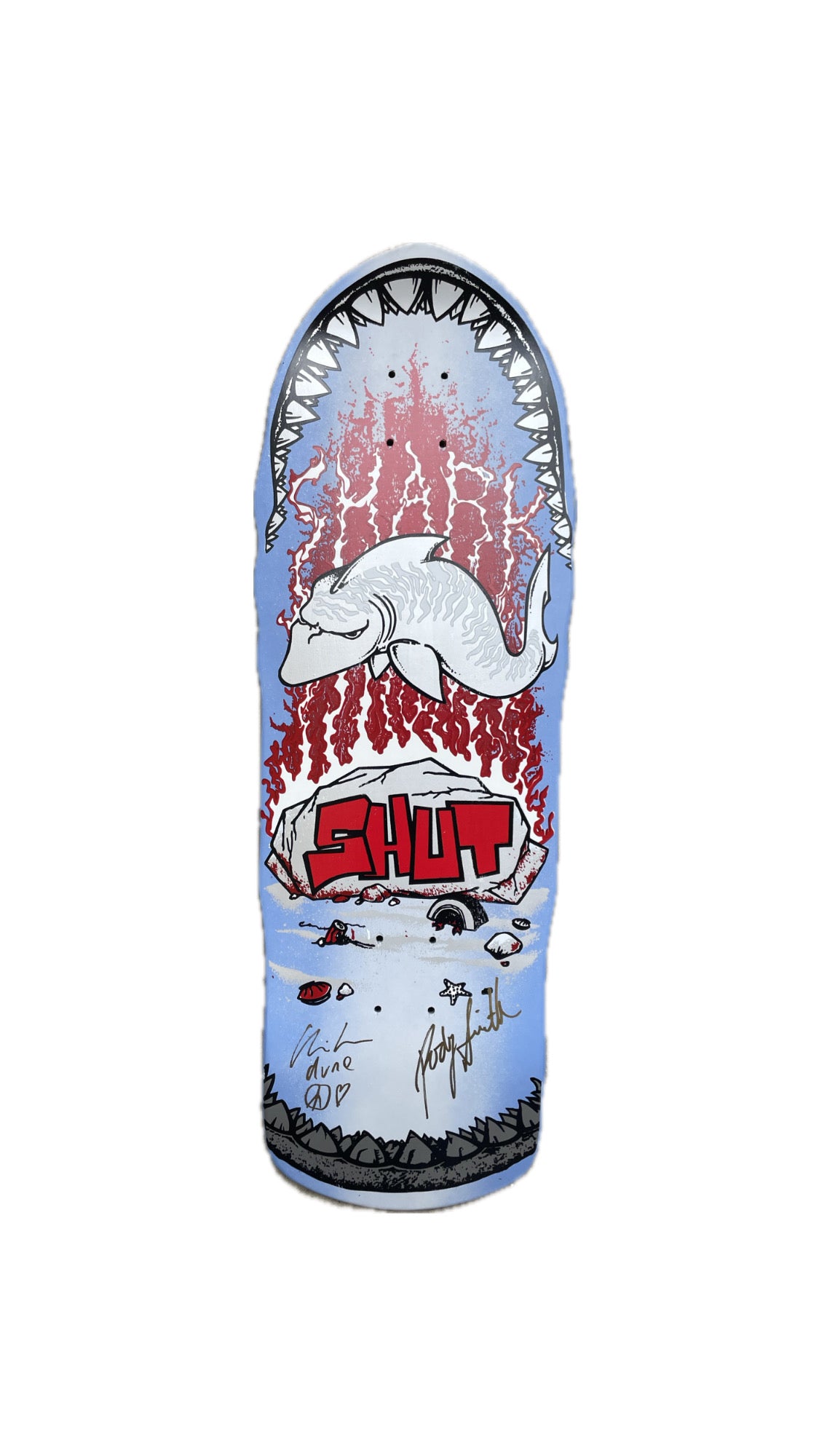 This reissued SHUT “Shark” deck Hand Fade Spray by Eli Morgan Gesner and was produced by Prime and is signed by SHUT founder Rodney Smith and pro skater/artist Chris Pastras. With its handmade, screen-printed construction and dual signatures, it’s a rare collector’s piece that honors authentic NYC skate history.