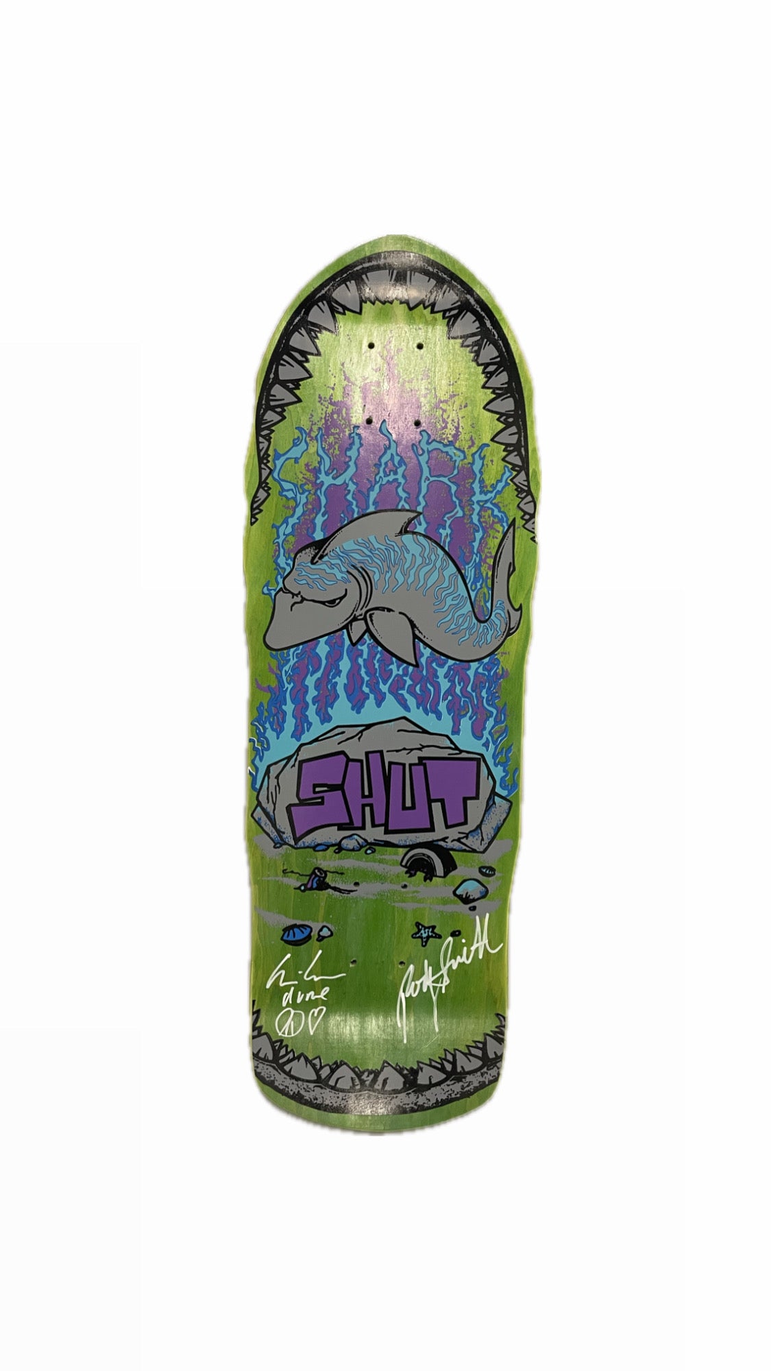 This reissued SHUT “Shark” deck was produced by Prime and is signed by SHUT founder Rodney Smith and pro skater/artist Chris Pastras. With its handmade, screen-printed construction and dual signatures, it’s a rare collector’s piece that honors authentic NYC skate history.