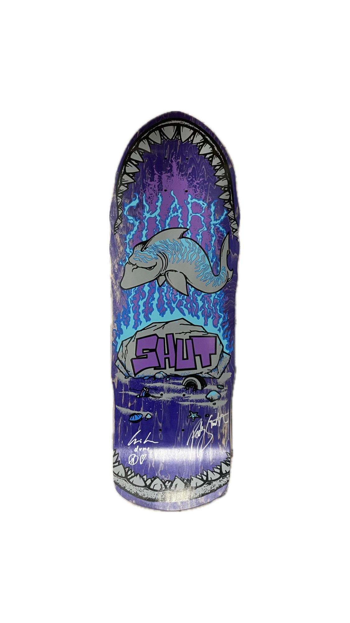 This reissued SHUT “Shark” deck was produced by Prime and is signed by SHUT founder Rodney Smith and pro skater/artist Chris Pastras. With its handmade, screen-printed construction and dual signatures, it’s a rare collector’s piece that honors authentic NYC skate history.